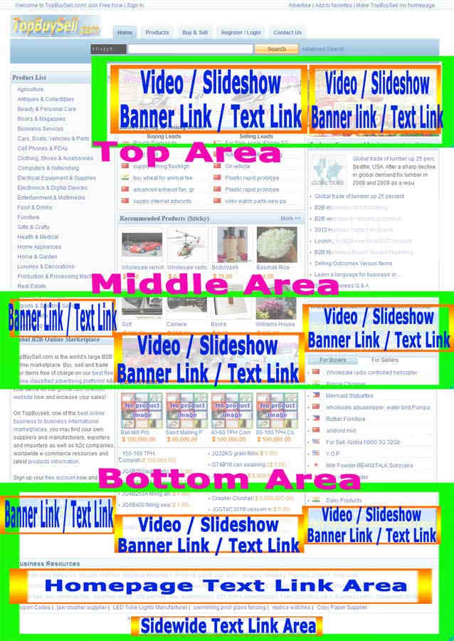 TopBuySell offers a range of advertising services. We have different advertising options to suit your needs: video ads, slideshows, banners, post links, text links and so on. Below is the homepage which shows the available advertising area: