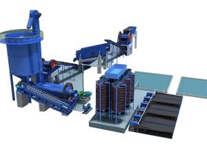 The raw chrome ore is fed into the jaw crusher for crushing, then the crushed material will come into the ball mill for grinding the smaller size (0.03-0.2mm), which is well suitable for spiral chute separating. As roughing equipment, spiral chute can make the chrome ore grade increasing higher, but if want to get the better grade product, the final concentrator, shaking table is needed. The operate of chrome washing machine is easy and stable.